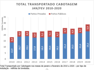 Of the total transported via cabotage in the first two months of this year, private ports accounted for 79.8%, totaling 23.2 million tons, with growth of 7.38% compared to the same period in 2019. Public ports represented 20.2% of the total transported via cabotage, registering 5.8 million tons and representing growth of 25.1% in comparison with January and February of last year.