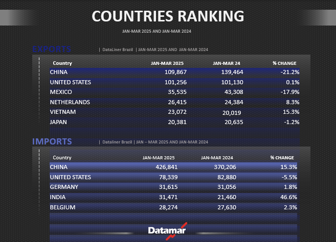 China was also the primary origin of Brazilian imports between January and March 2025, with volumes 15.3% higher than in the same period last year, followed by the United States (-5.5%) and Germany, whose shipments increased by 1.8%. See the full table below:
