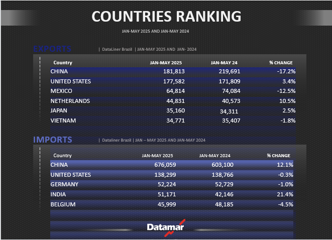 Check out the updated ranking of the top trading partners of the East Coast South American countries in containerized foreign trade, comparing the first five months of 2025 with the same period in 2024. Datamar’s Business Intelligence team prepared the data.