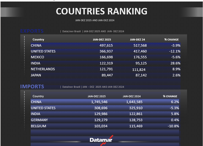 China was Brazil’s main trading partner in containerized exports in 2025, with a volume 3.9% lower than in 2024, followed by the United States, whose volume was 12.1% lower, and Mexico, whose shipments fell by 5.6%. See below: