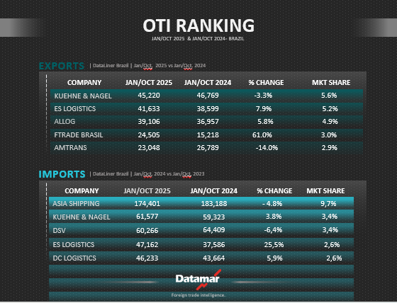See below the ranking of the 50 leading Ocean Transportation Intermediaries (OTIs) that maintained operations in Brazil and the Plate region in the first ten months of 2025, along with a comparison to the same period of 2024. It is worth noting that the OTI ranking is compiled from data from multiple sources, collected and adjusted by Datamar’s Business Intelligence team. Some volumes may differ from those recorded in DataLiner: