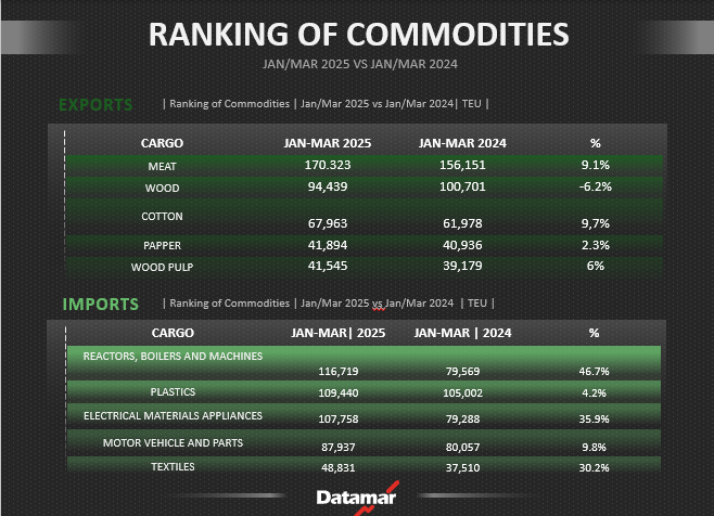 Check below the ranking of the main goods moved via containers along the East Coast of South America, specifically Brazil and the Plate region, in the first quarter of 2025, compared with the same period in 2024. Datamar’s Business Intelligence team compiled the data: