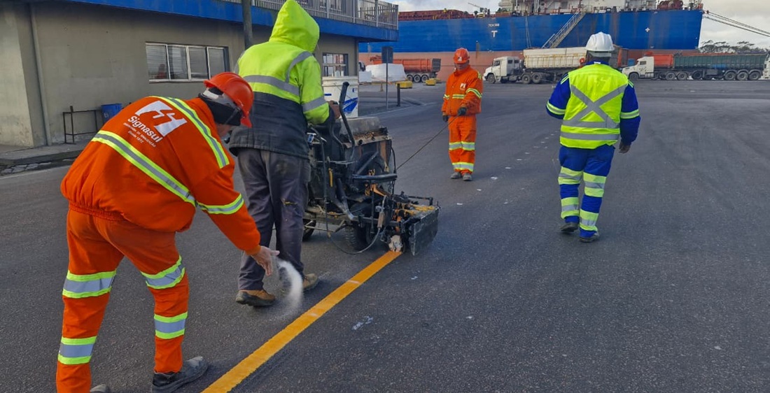 Portos RS has begun maintenance work on signage in the primary area of the Port of Rio Grande. The initiative includes the renewal of signage and the installation of concrete barriers. The goal is to ensure safety and organize the flow of vehicles and pedestrians circulating in the area. Portos RS expects to complete the horizontal signage for this first phase by the end of the month. Next will be the installation of vertical signage, followed by the delivery of concrete barriers and a semi-gantry sign structure in September.