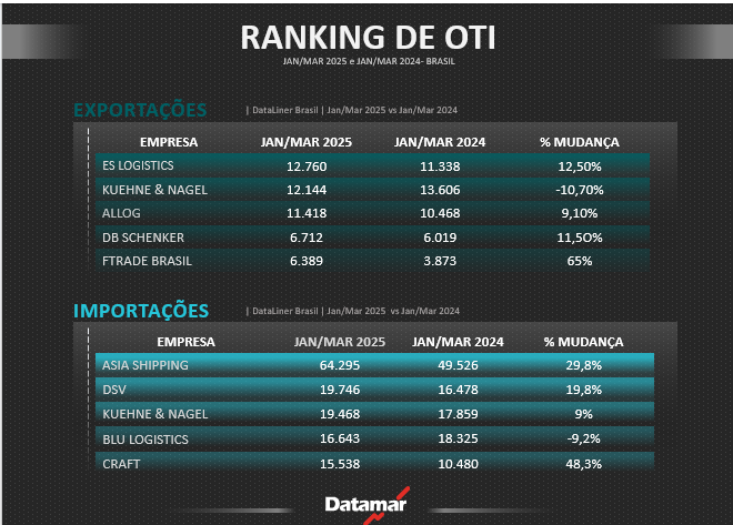 Confira a seguir o ranking das 50 principais Ocean Transportation Intermediaries (OTIs) que mantiveram operações no Brasil e na região do Plate nos três primeiros meses de 2025 e seu comparativo com igual período de 2024.Vale lembrar que o ranking de OTIs é elaborado com base em dados de múltiplas fontes coletados e ajustados pela equipe de Business Intelligence da Datamar. Alguns volumes podem diferir dos registrados no DataLiner: