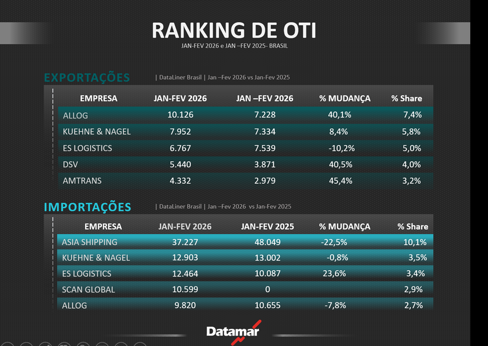 Confira a seguir o ranking das 50 principais Ocean Transportation Intermediaries (OTIs) que mantiveram operações no Brasil e na região do Plate no primeiro bimestre de 2026 e seu comparativo com igual período de 2025. Vale lembrar que o ranking de OTIs é elaborado com base em dados de múltiplas fontes coletados e ajustados pela equipe de Business Intelligence da Datamar. Alguns volumes podem diferir dos registrados no DataLiner: