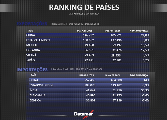 Ranking de parceiros comerciais da Costa Leste da América do Sul | Jan-Abril 2025 vs. Jan-Abril 2024 | DataLiner
