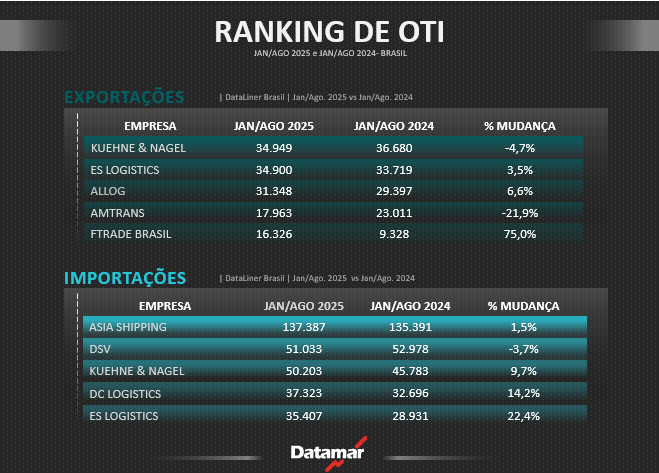 Ranking de parceiros comerciais da Costa Leste da América do Sul | Jan-Ago 2025 vs. Jan-Ago 2024 | DataLiner