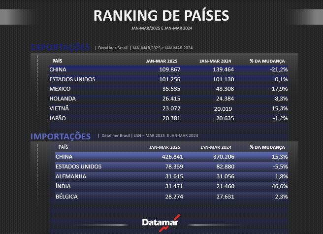 A China também foi a principal origem das importações brasileiras entre os meses de janeiro a março de 2025, com um volume 15,3% superior ao de igual período do ano passado, seguida por Estados Unidos (-5,5%) e Alemanha, cujo embarques cresceram 1,8%, Veja a seguir a tabela completa: